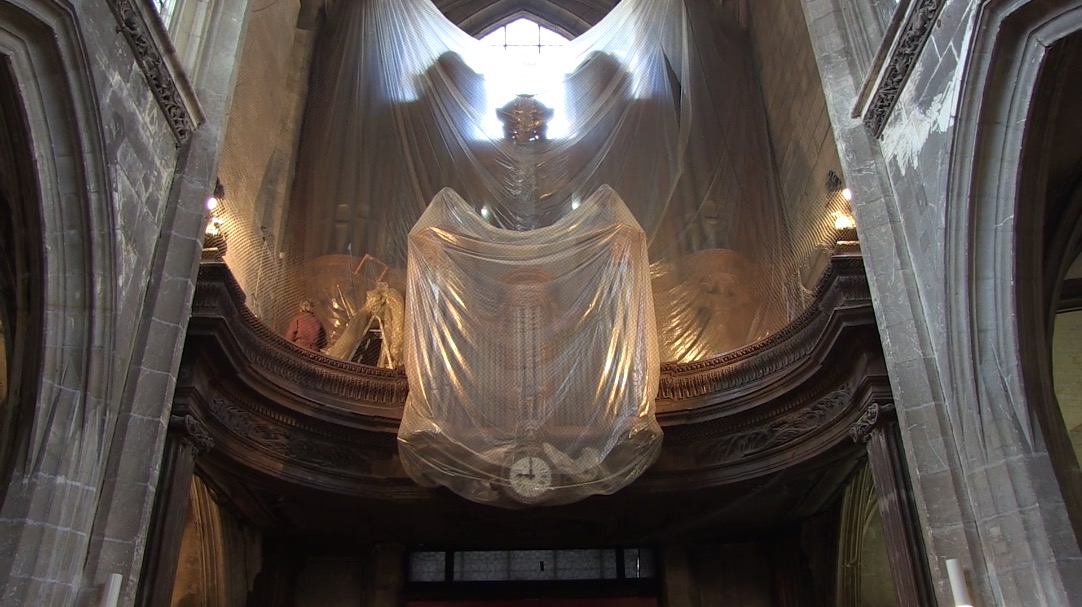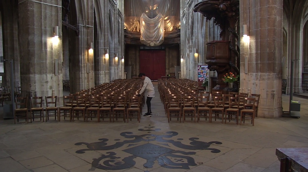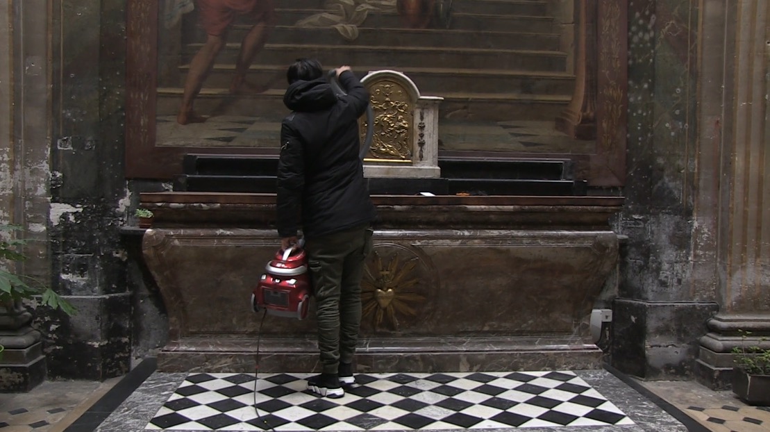Un microcosme dans un décor d’église gothique. On y rencontre un sacristain berbère, du brouillard, des Chinois, un homme en costume rose, des osties, de la musique étrange, et même du cinéma.